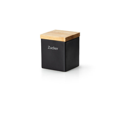 Die praktische Vorratsdose aus schwarzer Keramik passt mit dem hellen Holzdeckel in jede Küche. Damit alles gut verschlossen bleibt, ist im Deckel ein Siliconring integriert. Die Änderung der Beschriftung ist kein Problem - innen liegen Etiketten mit alternativen Beschriftungen.