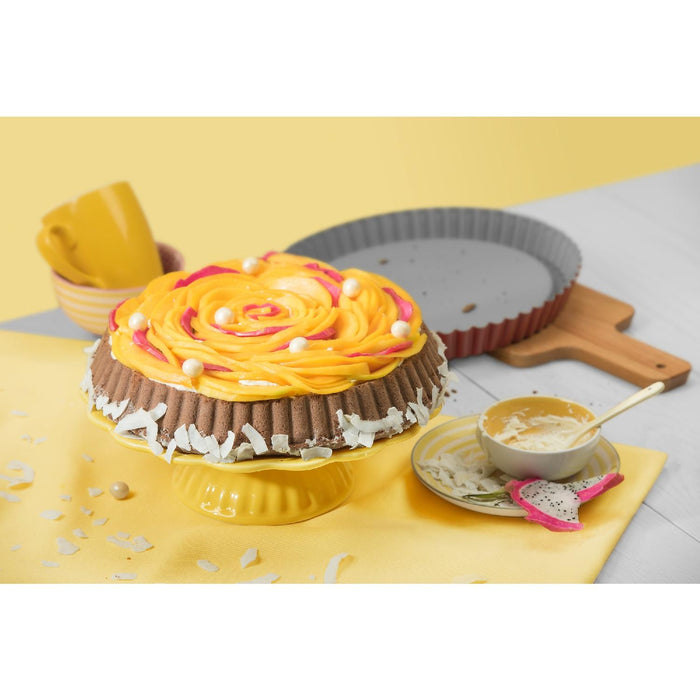 Die Obsttortenbodenform erkennen Sie an ihrem gewellten Rand. Der Gebrauch ist kinderleicht durch die Formen in emaillierter Oberfläche und keramischer Antihaftbeschichtung kann der Tortenboden nach dem Backen perfekt aus der Form gleiten. Danach belegen Sie ihren Obsttortenboden beliebig mit süßen Zutaten.