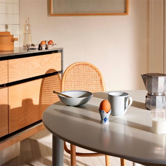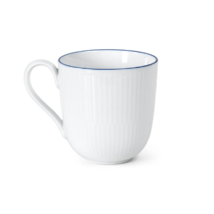 Die Schönheit des Blueline Bechers liegt in seiner Schlichtheit: Das weiße, geriffelte Porzellan ist am oberen Rand mit einer handgemalten, dünnen blauen Linie abgeschlossen. Dabei denkt man unweigerlich an ruhige, frühe Morgenstunden in einem Landhaus.