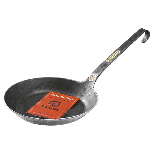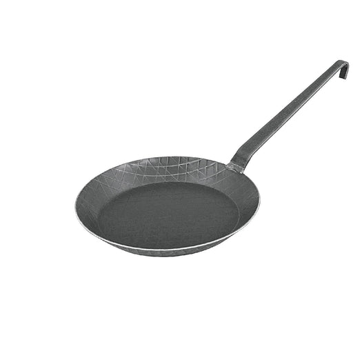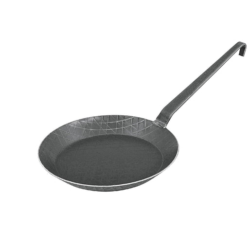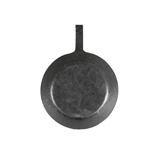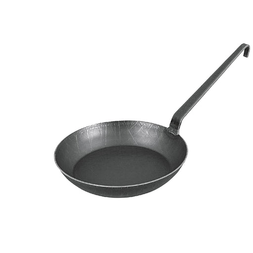 warmgewalztes Grobblech, geprägt, Pfannenboden geschlagen, rustikales Aussehen, mit geschmiedetem Hakenstiel am Pfannenboden angeschweißt, höhere V...