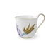 Die glänzenden Blätter und die extravaganten Blüten des Rhododendrons sind auf der Flora Tasse mit dem hohen Henkel in einem sanften Violett wiedergegeben, was die Tasse unverwechselbar und elegant zugleich macht