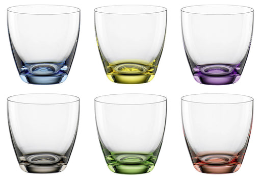 6 Whisky- oder Wasserbecher je 300 ml. Jedes Glas mit einem eganten, dezent farbigen Glasboden dekoriert.