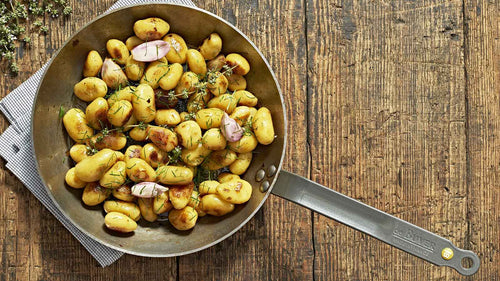 Das formstabile Kochgeschirr Mineral B aus weißem Walzstahl mit Bienenwachs, der gegen Oxidation schützt und das Einbrennen erleichtert.