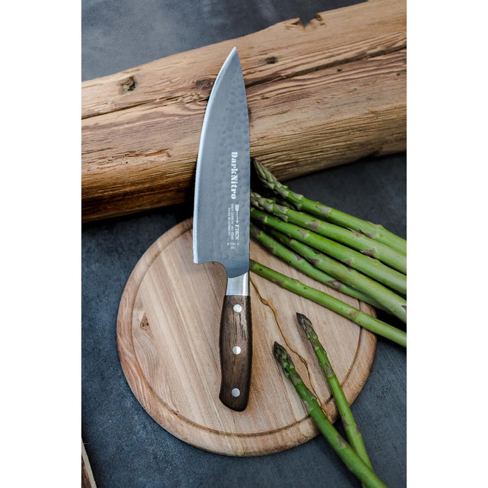 Die geschmiedete Serie DarkNitro ist ultimative Messerkunst. Das Zusammenspiel zwischen der einzigartigen Klingenoptik mit Hammerschlag-Prägung und dem besonderen Eichenholzgriff zeichnet diese Unikate aus. Für die extreme Schärfe werden die Klingen zusätzlich eisgehärtet. - MADE IN GERMANY