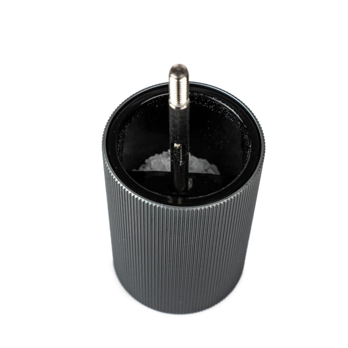 - Einstellknopf für den Mahlgrad: Je stärker er angezogen wird, desto feiner das Salz (und umgekehrt)