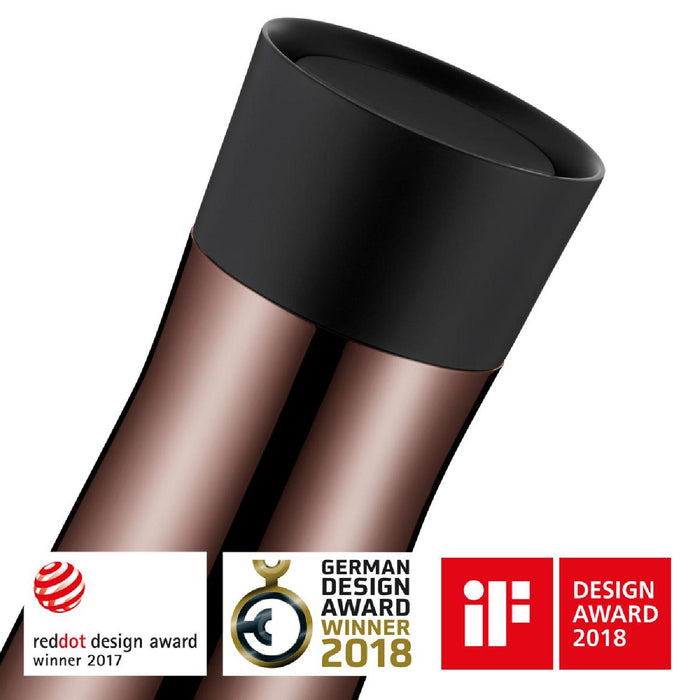Kalter Kaffee war gestern! Wer sein morgendliches Heißgetränk trendy veredeln und mit gutem Gewissen genießen will, der setzt heute auf seinen eigenen Isolierbecher. Mit dem 0,35 l Impulse macht WMF dem Kultgetränk nun Beine. In vier Ausführungen ? Edelstahl, Vintage Kupfer, Schwarz und Anthrazit ? wird der Becher auch unterwegs zum zuverlässigen Begleiter. Ein dickwandiger Kern hält Tee und Kaffee auf Temperatur, während der Deckel mit Schraubverschluss alles ordentlich abdichtet, selbst wenn der Becher in der Tasche auf die Seite kippt. Eine 360-Grad-Öffnung erlaubt es zudem, von jeder Seite des Bechers zu trinken, und macht Kleckern fast unmöglich. Am Ende des Tages kann der Verschluss zerlegt und somit besonders einfach gereinigt werden.