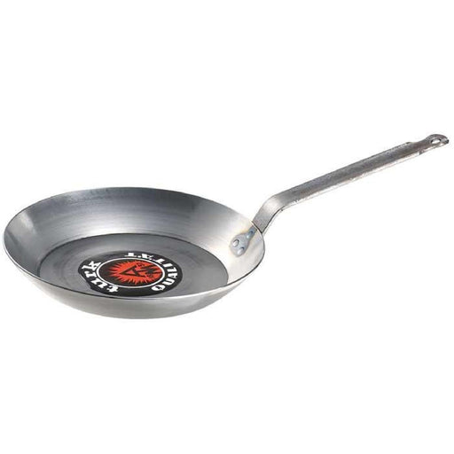 warmgewalztes Grobblech, geprägt, Pfannenboden geschlagen, rustikales Aussehen, mit geschmiedetem Hakenstiel am Pfannenboden angeschweißt, höhere V...