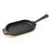 Bratpfanne aus Gusseisen mit Griff und Holzunterlage.