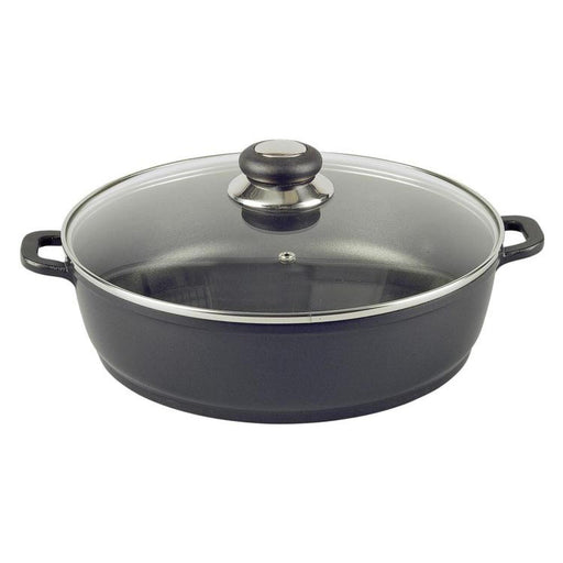 Die Karl Krüger Servierpfanne Delta (Ø 28 cm) aus hochwertigem Aluguss ist ideal zum scharfen Anbraten, Braten und Servieren von Fleisch, Gemüs...