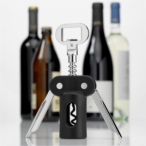Den WMF Korkenzieher einfach auf die Flasche aufsetzen und die Schraube drehen. Die beschichtete Spindel gleitet wie Butter in den Korken und zieht ihn durch Weiterdrehen einfach heraus