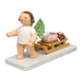 Beschwingten Schrittes zieht der Elfpunkte-Engel seinen Schlitten durch den Schnee – mit köstlicher Ladung: Einen Weihnachtsstollen hat er mit Seidenband auf dem Schlitten befestigt, dazu zwei mit Mandeln verzierte Lebkuchen. Christstollen haben in Deutschland eine lange Tradition, ihre Form erinnert an das gewickelte Tuch, in dem das Jesuskind in der Krippe lag. Der brotförmige Hefeteig wird mit Rosinen, Mandeln und Gewürzen verfeinert und mit Puderzucker bestreut. Dass in der Manufaktur nicht nur versierte Kunst-Handwerkerinnen und -Handwerker arbeiten, sondern auch wahre Kenner der Backkunst, beweist diese Figurenkomposition. Aus zwei Holzteilen wird der Stollen zusammengesetzt, damit in der Mitte die typische Kerbe entsteht. Mit verschiedenen Brauntönen streichen die Malerinnen den Stollen ein – unter anderem in einem „Knusper-Röst-Ton“, wie ihn die Produktgestalterin nennt. Die Rosinen werden mit feinem Pinsel aufgetupft, bevor mit einem sogenannten Schwämmchenpinsel der Zucker „drübergestreut“ wird. Für ein wenig Schneegestöber sorgen die Handwerkerinnen, indem sie ein hauchzartes Blau auf die weiße Sockelplatte aufbringen. Auf eine himmlisch-köstliche Weihnachtszeit!