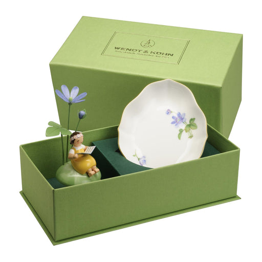 Ein Motiv der „Meissner Blumentafel“ – einer historischen Abbildung, die 36 kunstvolle Blütenzeichnungen zeigt – war abermals Vorlage für die Figurenkomposition und Bemalung des Schälchens. In diesem Jahr ziert ein Leberblümchen die formschöne, mit Goldrand veredelte Porzellanschale. Erneut bestand die Herausforderung darin, die Formgebung und Farbvirtuosität der Meissner Zeichnung in die figürliche Fertigung der Grünhainichener Manufaktur zu überführen. Unterschiedliche Blautöne, teils lasierend auf die hauchdünnen Blütenblätter des Leberblümchens aufgetragen, bilden den Untergrund, auf den die Malerinnen mit ruhiger Hand die zarten Linien und Punkte für die Staubblätter setzen. Ebenso viel Sorgfalt wird in die Bemalung der grünen Blätter gelegt – mit Lasuren und feinsten Pinselstrichen für die Blattadern. Im Schutz des Blätterdaches sitzt ein kleines Mädchen. Mit sonnengelbem Trägerkleid und entzückendem Blumenkranz ist es in sein Buch vertieft. Ein Anblick, der fröhlich stimmt und lächeln lässt. Und eine bezaubernde Vollendung eines Figuren-Trios, flankiert von drei edlen Meissner Porzellanschälchen.