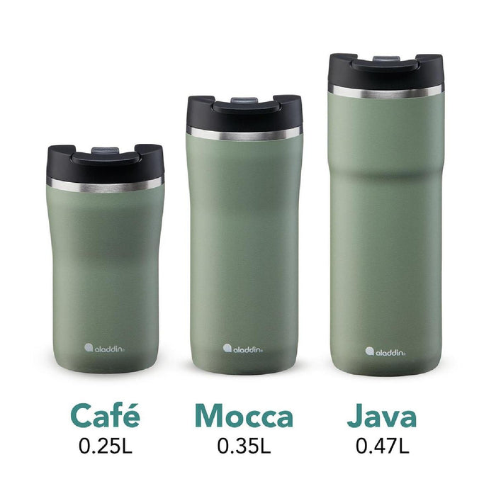 Die vakuum-isolierten Edelstahlbecher der Barista Kollektion glänzen mit einem kuratierten Farb- und Größensortiment, mit dem Sie Ihr Lieblingsgetränk überall genießen können ? ohne Kompromisse. Die innovativen Aladdin Becher punkten mit der eigens entwickelten Vakuumisolierung, genannt ?Thermavac??, diese hält heiße Getränke bis zu 4 Stunden heiß und kalte Getränke bis zu 6 Stunden kalt. Die griffige, extrem langlebige Pulverbeschichtung sorgt für komfortablen Halt und macht die vakuum-isolierten Edelstahlbecher zu stylischen To?Go Produkten, das Sie mit dem Leben in der Stadt verbindet. Der 100% auslaufsichere Verschluss wird zum Öffnen und Schließen einfach umgelegt und zusätzlich mit einem Schieber gesichert - kein versehentliches Öffnen oder Auslaufen mehr! Aladdin verwendet Qualitätsedelstahl, der frei von BPA und Weichmachern ist. Die Produkte können in die Spülmaschine.