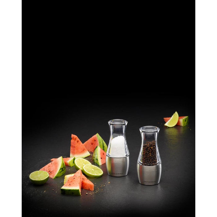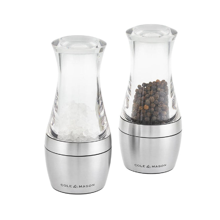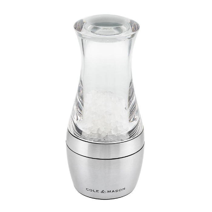 Die formschönen Präzisionsmühlen von Cole&Mason haben einen schlanken Acrylkörper und ein Edelstahl-Fuß. Das Besondere an dieser Mühle ist, dass das gesamte Mahlwerk sich im Fuß befindet, welcher sich einstellen und zugleich besonders einfach drehen lässt. Dadurch entfällt die Mittelachse und der Drehmechanismus funktioniert reibungslos. Die Reduzierung der Mittelachse verleiht der Mühle ihr offenes, ansprechendes Design und macht das Befüllen besonders einfach.