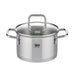 Der Topf verfügt über einen energiesparenden Kapselboden, der für eine gleichmäßige Wärmeverteilung sorgt und somit energiesparendes Kochen ermöglicht. Die satinierte Innenfläche ist mit einer praktischen Literskala und einem Öl-Dosiersystem ausgestattet, was präzises Kochen erleichtert. Der Glasdeckel mit stoßfestem Edelstahlrand ermöglicht einen Blick auf den Kochvorgang, während die Edelstahldrahtgriffe für eine sichere Handhabung sorgen.