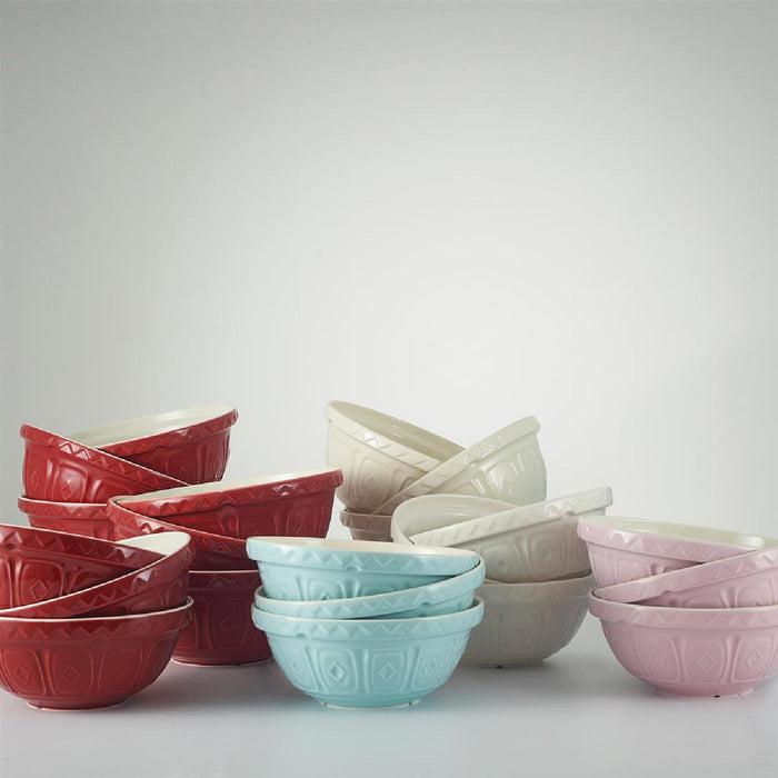 Die farbigen Rührschüsseln von Mason Cash besitzen einen ganz individuellen Charme, ob als Obstschale, Salatschüssel oder als Rührteigschüssel für das Zubereiten von Brot-, Kuchen-, Gebäck- und Pizzateig Kreationen, diese Schüssel verleiht Ihrer Küche einen freundlichen Farbtupfer. Das Design der Schale hat sich bewährt und wurde im Test der Zeit zum Designklassiker. Die Mason Cash Rührschüsseln werden aus hochwertigem, splitterresistentem Steingut hergestellt. Daher sind sie schwer genug um beim Mischen zu sicher zu stehen und gleichzeitig leicht genug, um komfortabel im Arm gehalten zu werden. Gleichzeitig ist der Rand der Rührschüssel ideal zum Greifen und zum Kippen. Die breite, flache Form ermöglicht bei Bedarf auch das Kneten innerhalb der Schüssel. Dank dieser positiven Eigenschaften ist die Mason Cash Rührschüssel zum Synonym für die Marke und fürs Backen überhaupt geworden. Das markant gemusterte Äußere und die 4 ansprechenden Farbtöne rot, cremeweiß, hellblau und pastellrosa machen diese Rührschüssel zum absoluten Hingucker. Die Rührschüssel ist in drei verschiedenen Größen 4 Liter, 2,7 Liter, 2 Liter erhältlich.