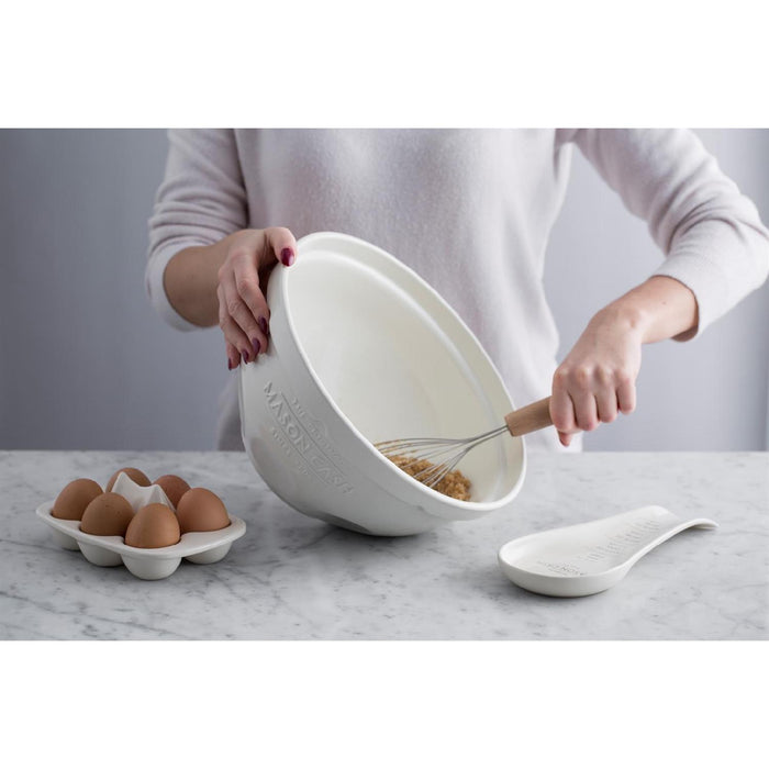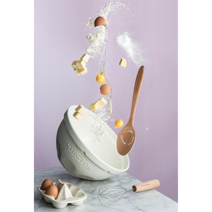 Steingut ? die ideale, plastikfreie Alternative für Ihre Küche. Plastikfrei, stilvoll und langlebig sind die eleganten Küchenprodukte aus splitterresistentem Steingut von Mason Cash. Sie sehen nicht nur besonders schön aus, sondern sind auch in der Anwendung sehr komfortabel. Durchdacht und mit praktischen Mehrwerten, ob Reibe im Deckel, Messskala oder luftdichter Verschluss ? die praktischen Utensilien liegen gut in der Hand und erledigen die Aufgaben mit Leichtigkeit. Sie sind zudem sehr robust und langlebig und sorgen für mehr Freude in der Küche. Das glasierte Steingut ist splitter-resistent sowie spülmaschinen- und mikrowellengeeignet. Die innovative Rührschüssel lässt sich leicht kippen und gut im Arm halten - zudem ist der Rand ist ideal zum Greifen und zum Kippen. Für komfortables Rühren. Die breite, flache Form ermöglicht bei Bedarf auch einfaches Kneten innerhalb der Schüssel. Aus hochwertigem, splitter-resistentem Steingut.