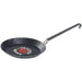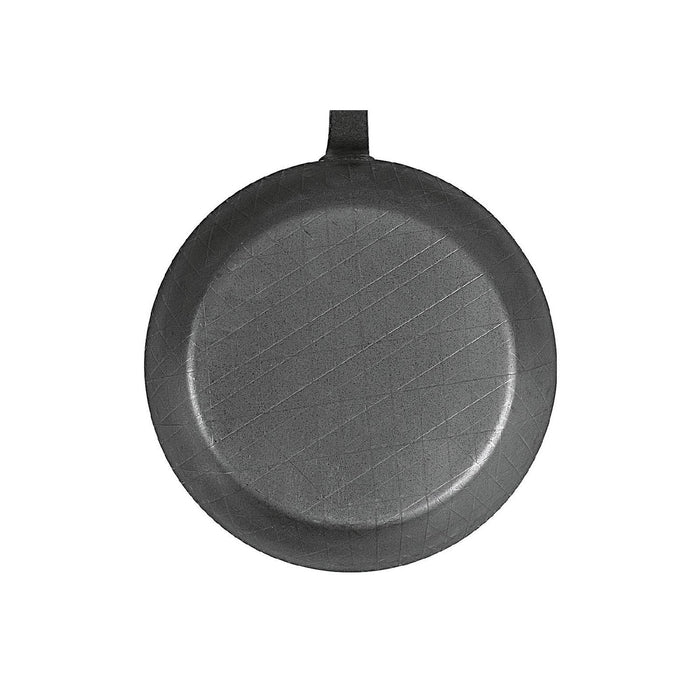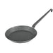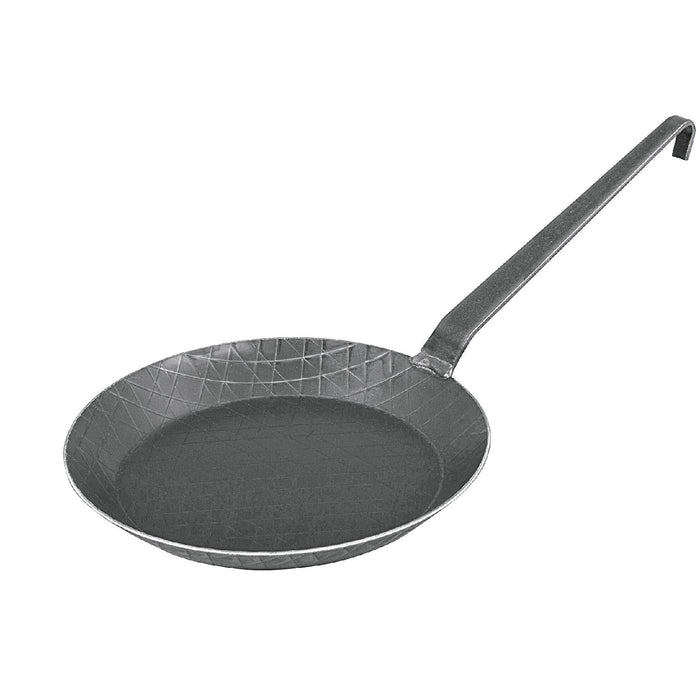 warmgewalztes Grobblech, geprägt, Pfannenboden geschlagen, rustikales Aussehen, mit geschmiedetem Hakenstiel am Pfannenboden angeschweißt, höhere Verdichtung - bessere Brateigenschaft. Für alle Herdarten geeignet (Elektro – Ceran – Gas – Induktion – offenes Feuer). Wichtig: Kochstelle gleiche Größe wie Pfannenboden, um Beschädigung der Pfanne zu vermeiden. Die Pfannen sind kratz- und schnittfest und besitzen somit eine enorme Lebensdauer.