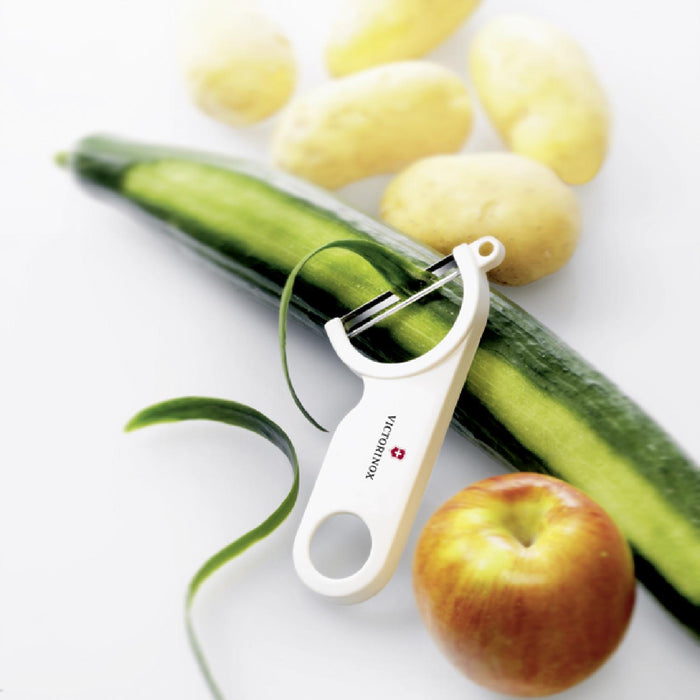Der einfache Gemüseschäler ist der Leistungsträger in der modernen Küche. Er besitzt eine drehbare rostfreie Pendelklinge, die die Schale extra dünn ablöst. Hier bleibt auch nichts hängen. So wird Schälen zum Kinderspiel.